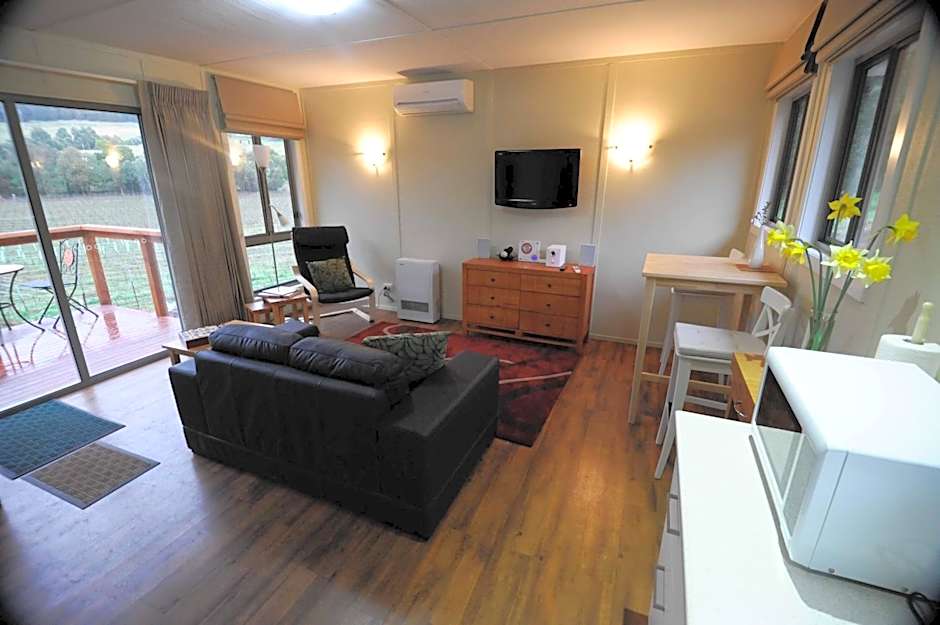 Cozy cottage has a lounge area and a well-equipped kitchenette. Outdoor deck comes with barbecue facilities and a seating area. Features views of the vineyard and the lake.